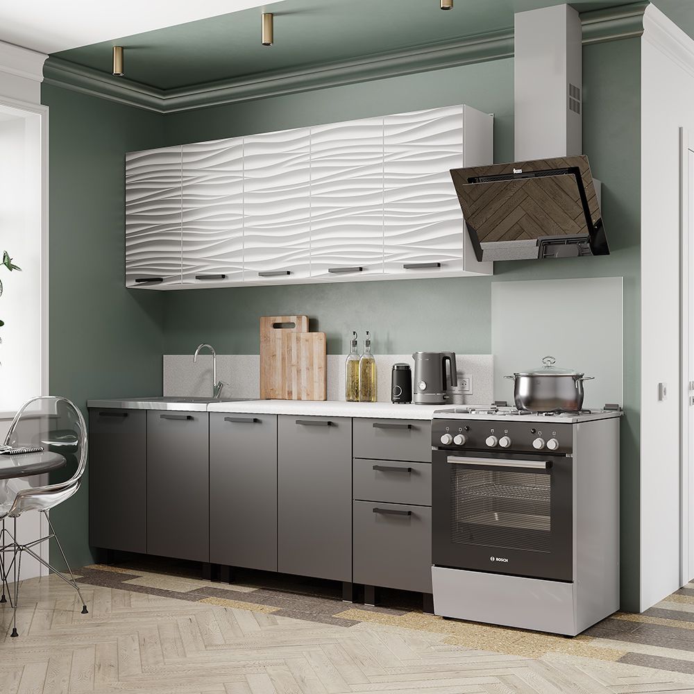 Сочетание холодного серого с теплым коричневым цветом нижних фасадов выглядит по-домашнему уютно и гармонично.