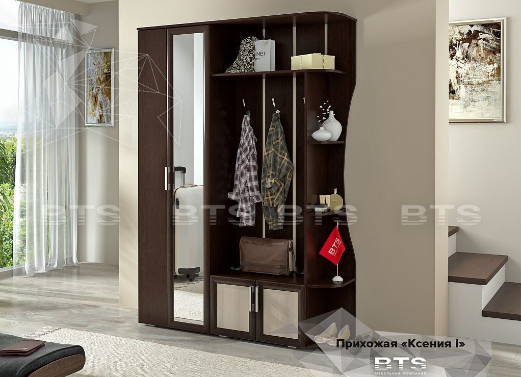 Прихожая "Ксения -1" приятно удивит Вас своими компактными размерами и вместительными системами для хранения верхней одежды, обуви и аксессуаров. Фасад шкафа декорирован большим зеркалом, позволяющим любоваться собой в полный рост. Лаконичный дизайн и контраст цветовых решений поможет создать неповторимый дизайн в вашем доме. Дополнительным удобством для Вас послужит выдвижная штанга и возможность сборки модели как на левую, так и на правую сторону.
