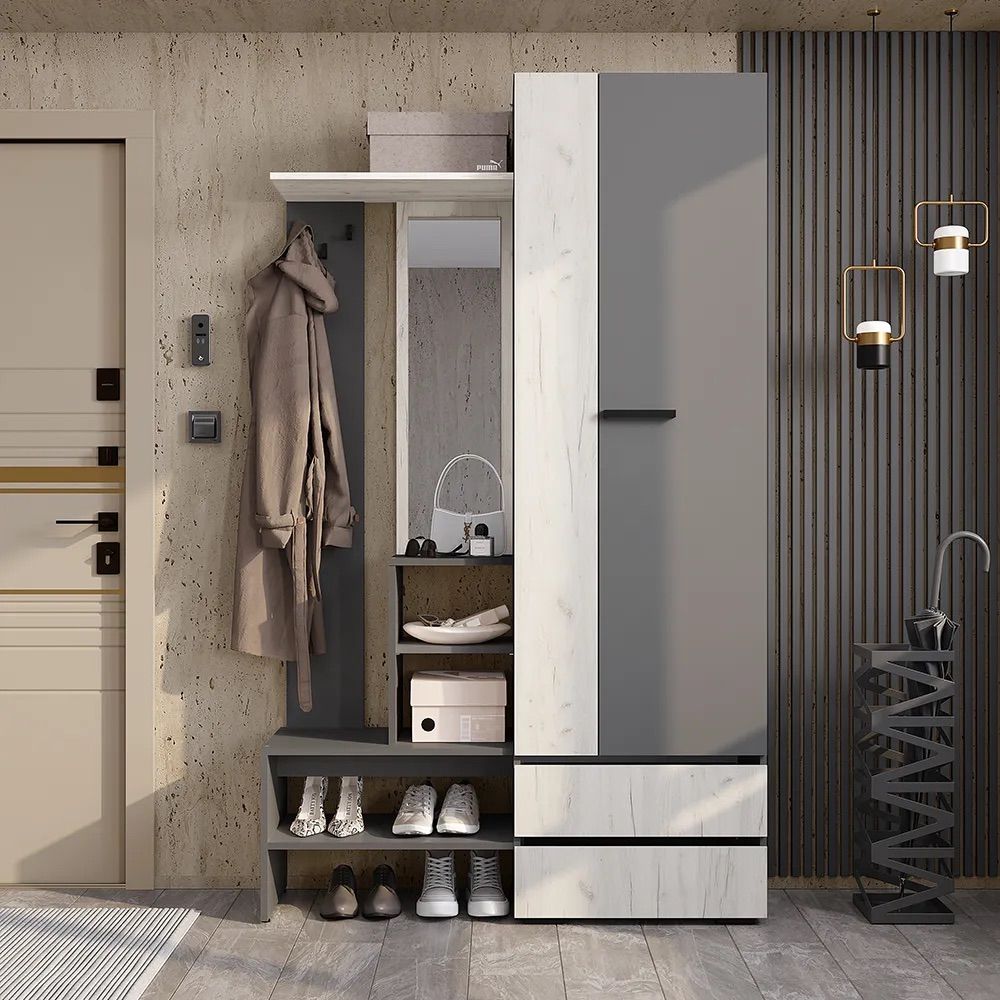 Этот стеллаж со шкафом в прихожую комнату станет отличным элементом для вашего интерьера. Мебель для дома обеспечивает удобное хранение перчаток, шапок, зонтов, сумок и других аксессуаров. Комплект включает шкаф для верхней одежды и настенную тумбу с зеркалом. Закрытые дверцами модули гарантируют порядок в коридоре.