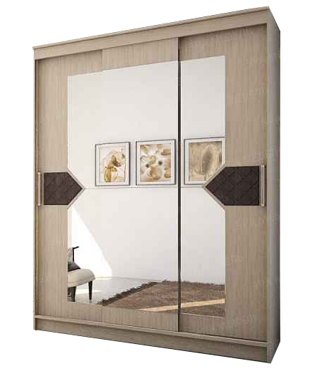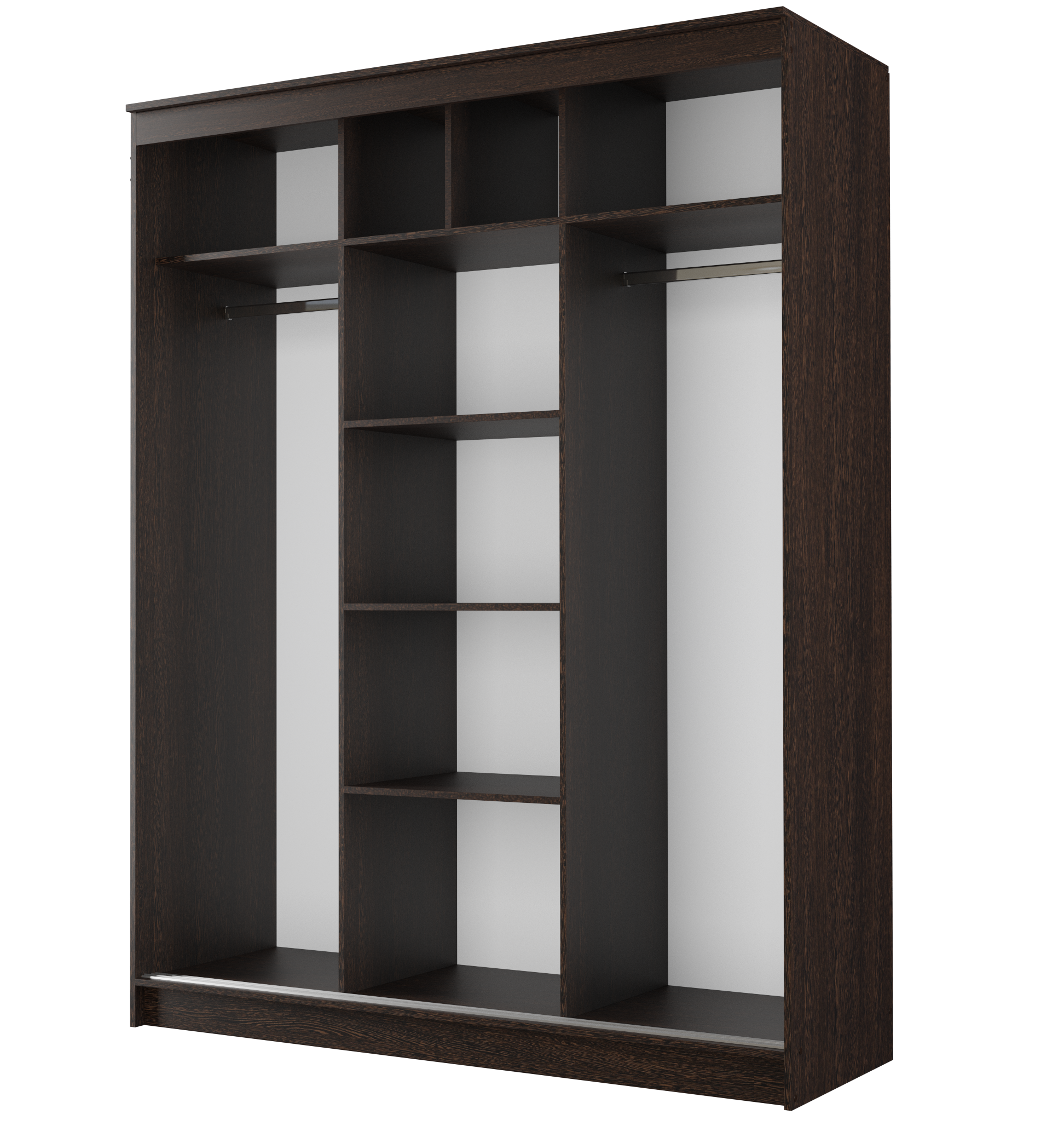 В нем предусмотрено два боковых отделения со штангами для подвешивания одежды на плечиках и одно широкое центральное с полками для хранения текстиля и других домашних вещей.