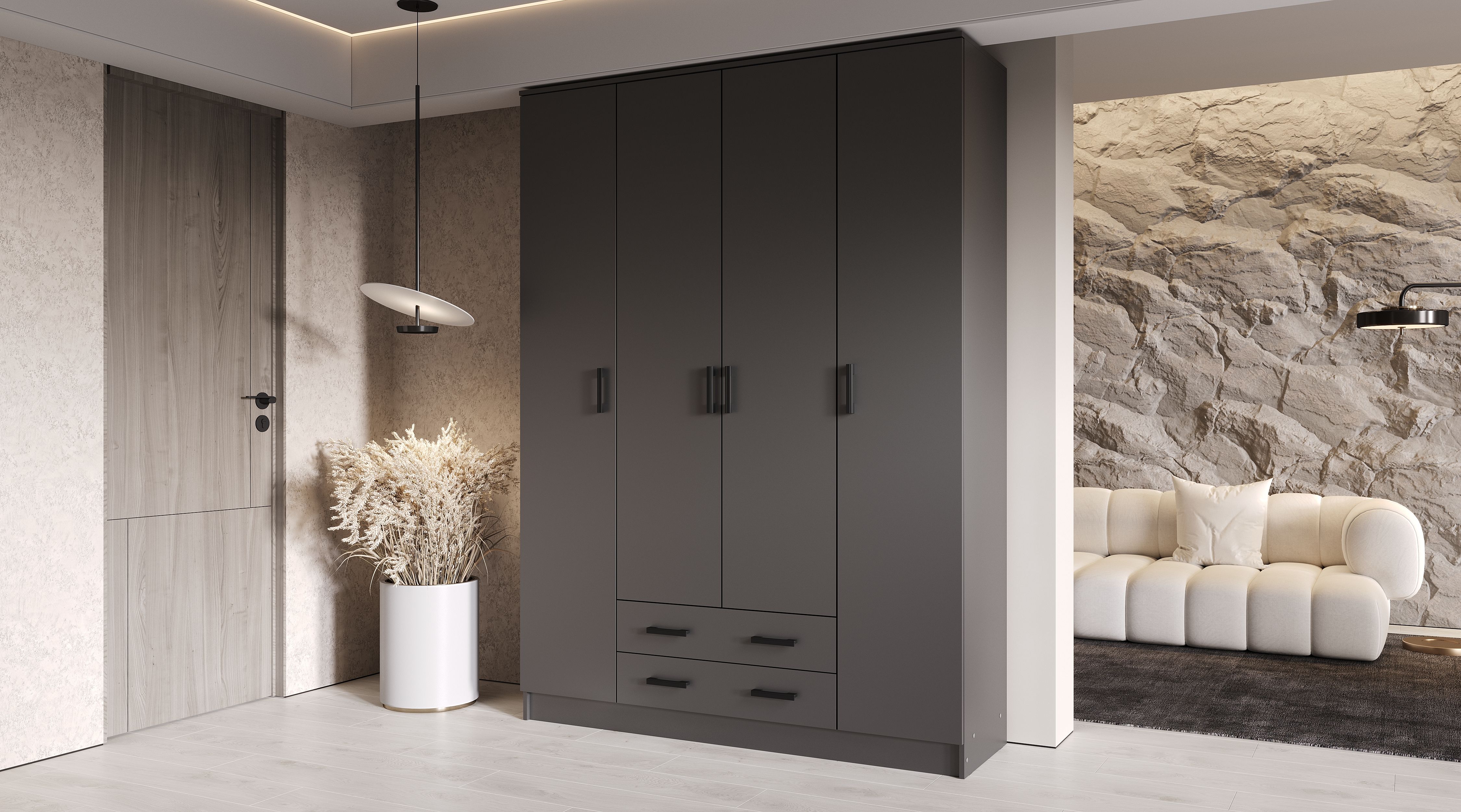 Четырехдверный шкаф "Квадро" - вместительная и эффектная система хранения. В нем предусмотрено два отделения с полками для хранения текстиля и одно широкое центральное с полкой для головных уборов, зонтов и других домашних вещей для подвешивания одежды на плечиках.
