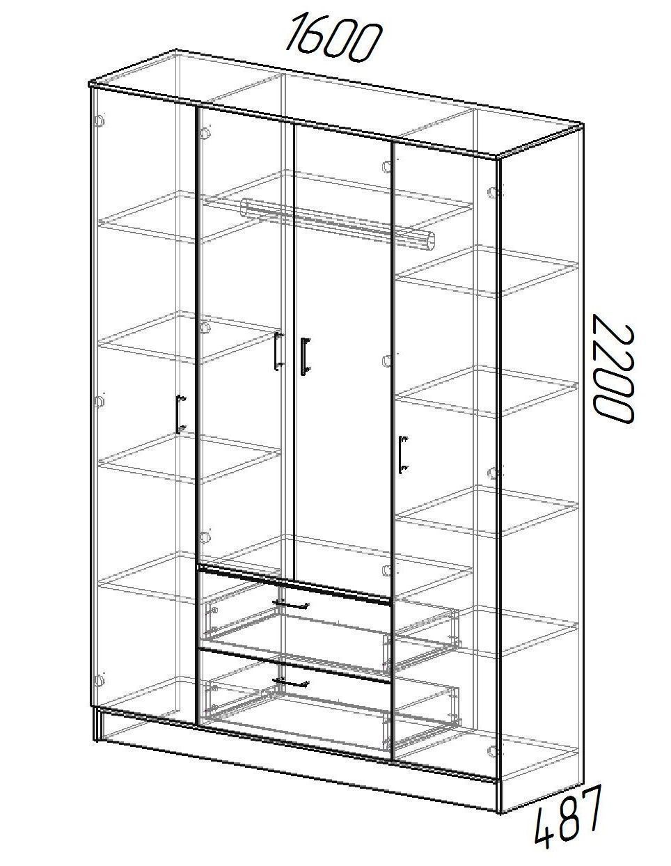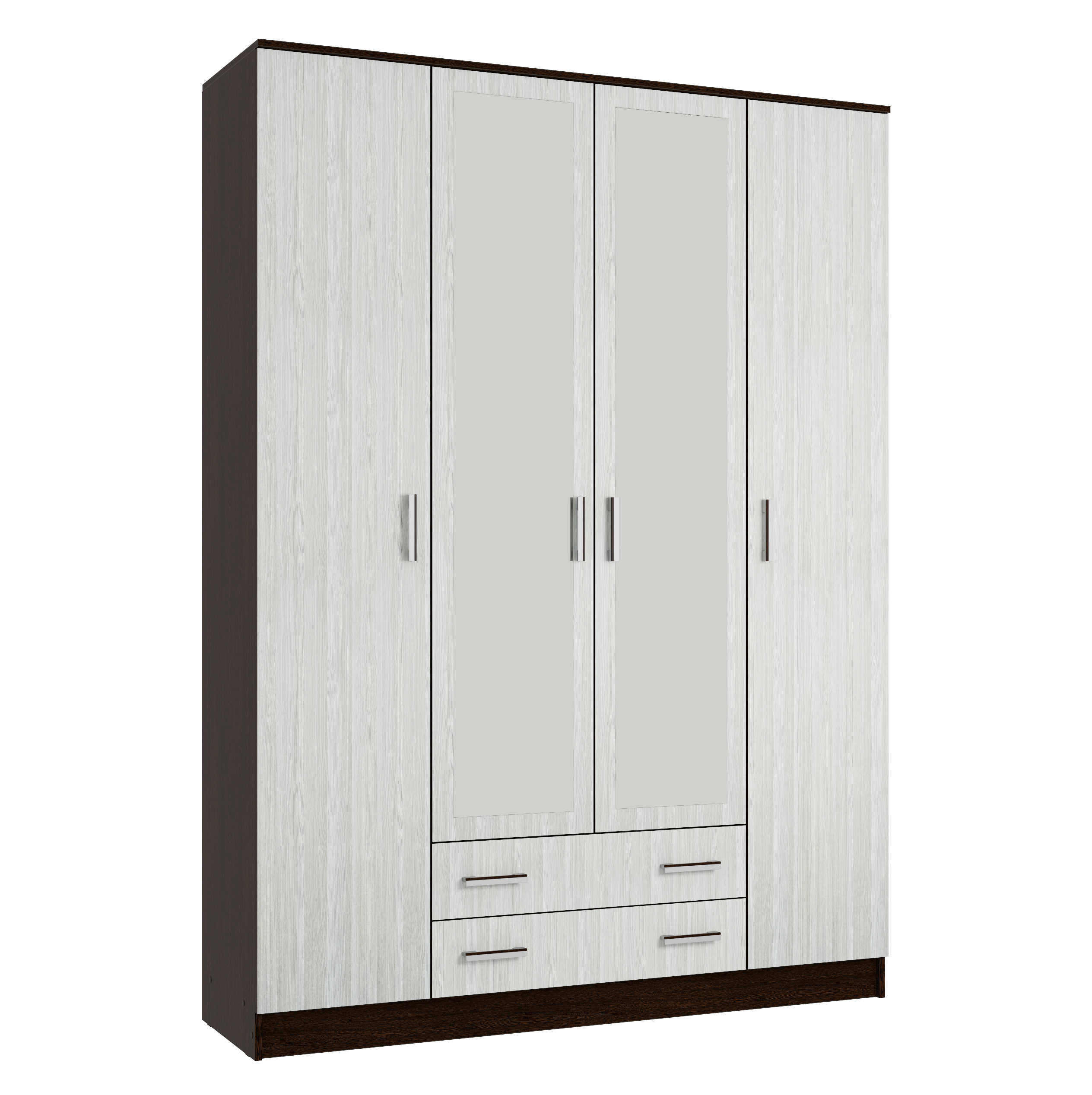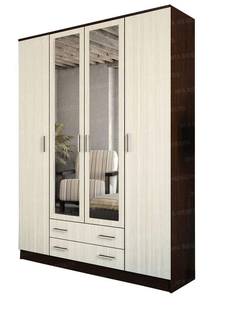 Четырехдверный шкаф "Квадро" - вместительная и эффектная система хранения. В нем предусмотрено два отделения с полками для хранения текстиля и одно широкое центральное с полкой для головных уборов, зонтов и других домашних вещей для подвешивания одежды на плечиках.