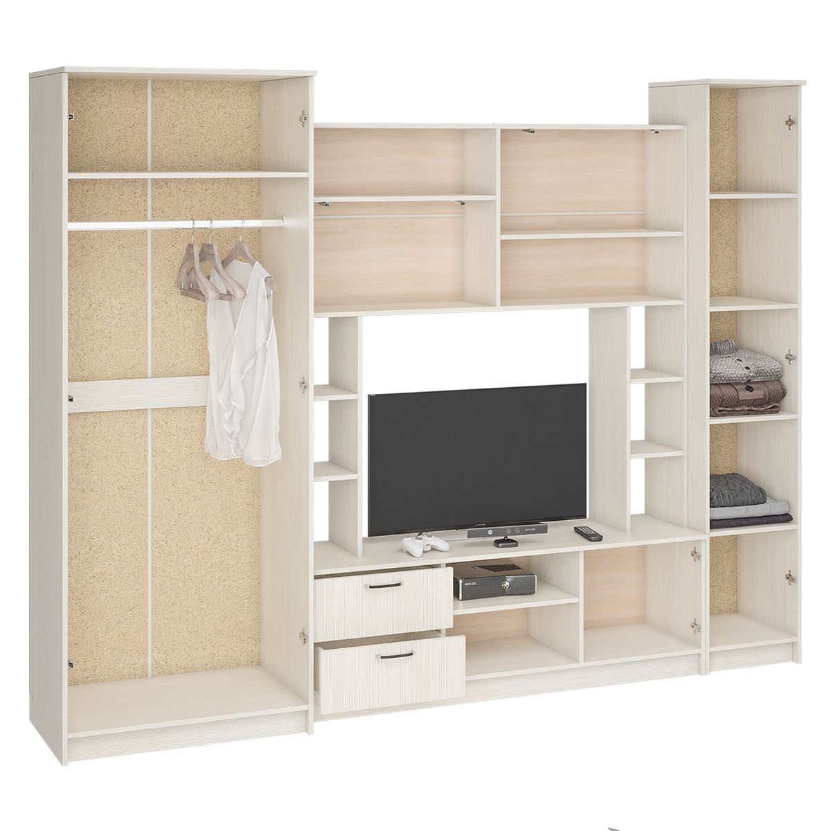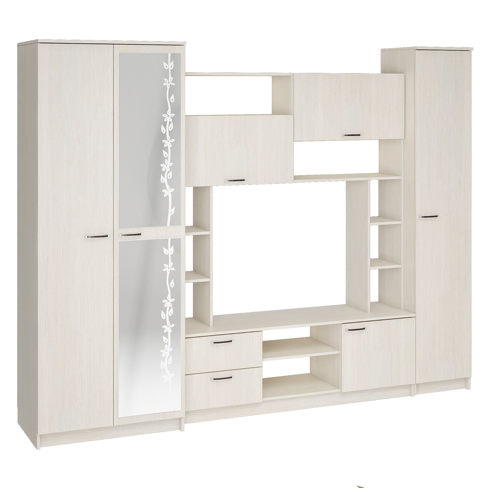- Гостиная состоит из трёх модулей (шкаф платяной, шкаф бельевой, средняя секция), которые при желании можно устанавливать отдельно друг от друга, размещая в разных комнатах;