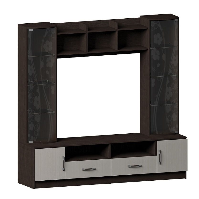 Оснащена вместительной нишей под телевизор, модулями с дверцами из тонированного стекла, подходящим для хранения книг и сувениров.
