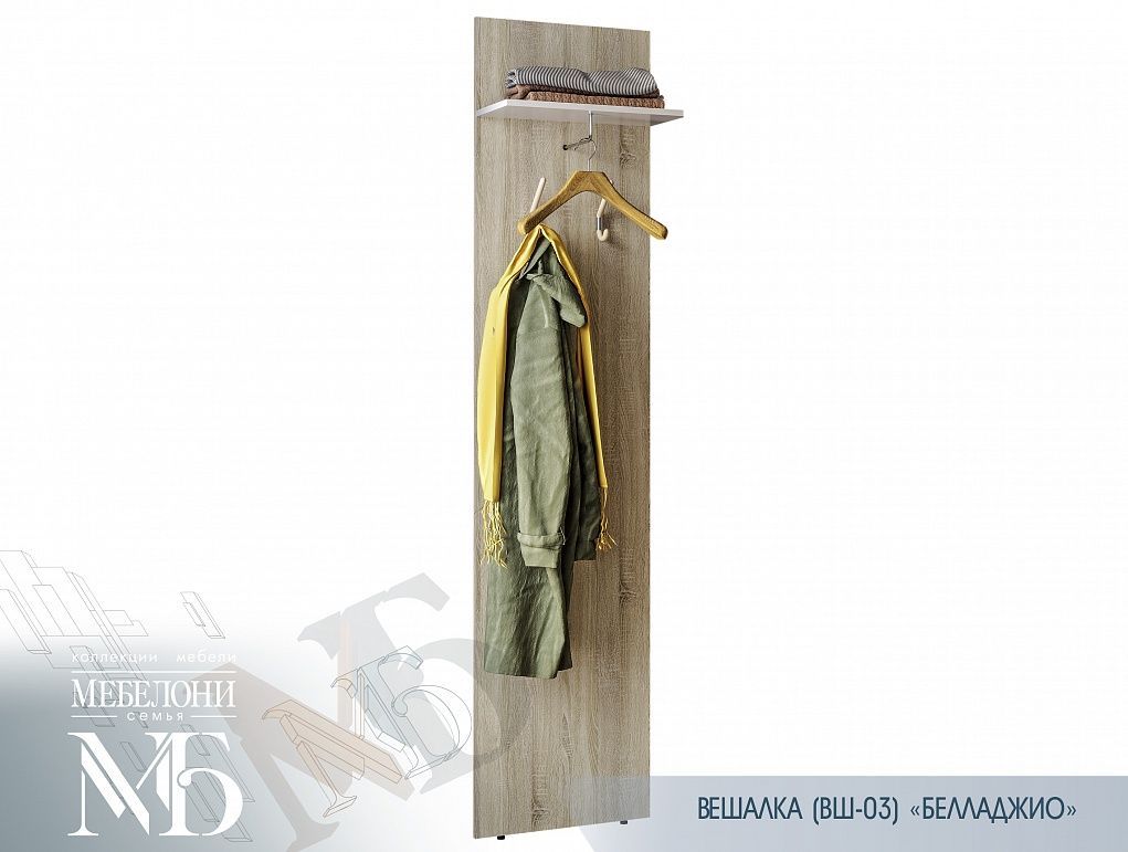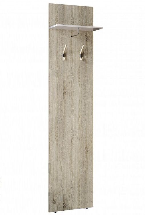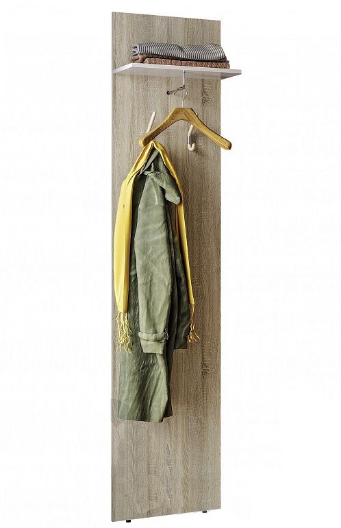 Модуль ВШ-03 - открытая вешалка из цельного ЛДСП в декоре "Дуб Сонома", обладает высоким функционалом - полка, из ЛДСП в декоре "Белый глянец", два крючка для верхней одежды и L-образный кронштейн для навеса верхней одежды.